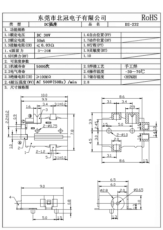 Typical Specifications 1. Rating : DC 30V 0.5A 2. Contact Resistance : 70?Max 3.Lnsulation Resistance: DC500V 1Minute 4.Operating Temperature Range: -25℃+80℃ 5.Ambient Humidity Used: ≤85%RH 6. Operating Force : 3-20N 7. Operating Life : 5,000Cycles