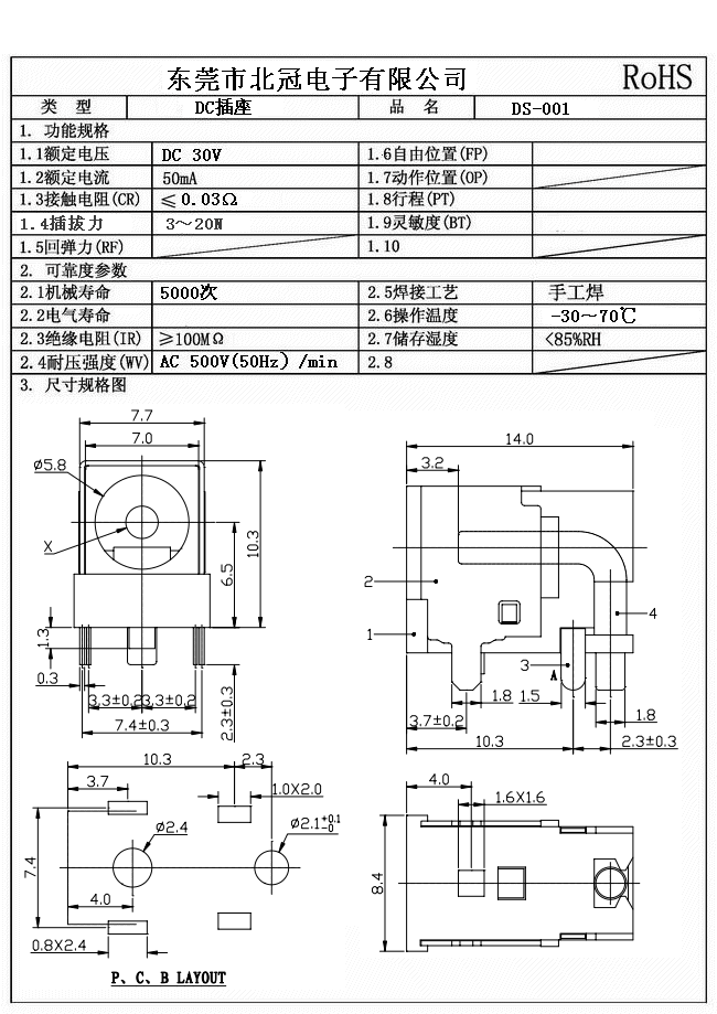 Typical Specifications 1. Rating : DC 30V 0.5A 2. Contact Resistance : 70ΩMax 3.Lnsulation Resistance: DC500V 1Minute 4.Operating Temperature Range: -25℃+80℃ 5.Ambient Humidity Used: ≤85%RH 6. Operating Force : 3-20N 7. Operating Life : 5,000Cycles