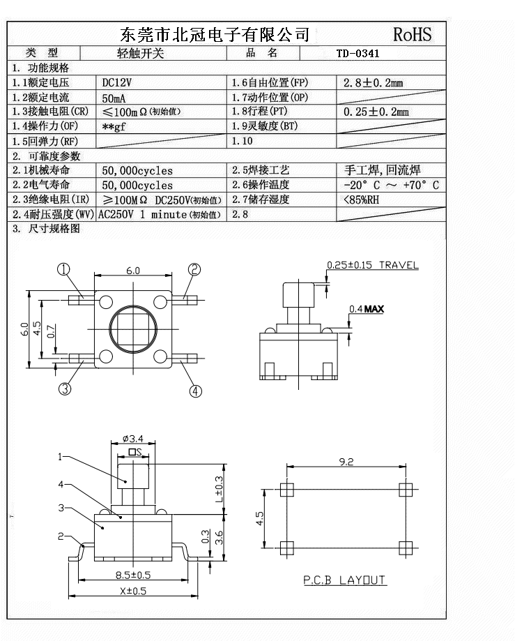 TD-0341是6*6*7.3輕觸開(kāi)關(guān),高度是固定的,按鍵頭尺寸是2.4*2.4,輕觸開(kāi)關(guān)TS-1109B按鍵力度有160g/250g四種。屬于環(huán)保輕觸開(kāi)關(guān)