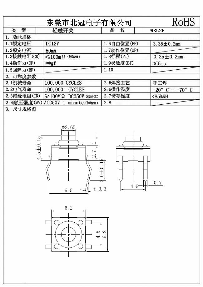產(chǎn)品名稱:WS62H輕觸開關(guān)