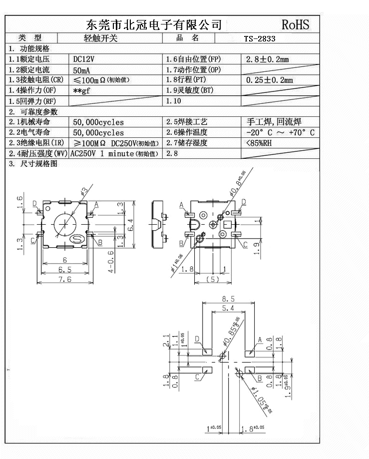 產(chǎn)品名稱:TS-2833輕觸開關(guān)
