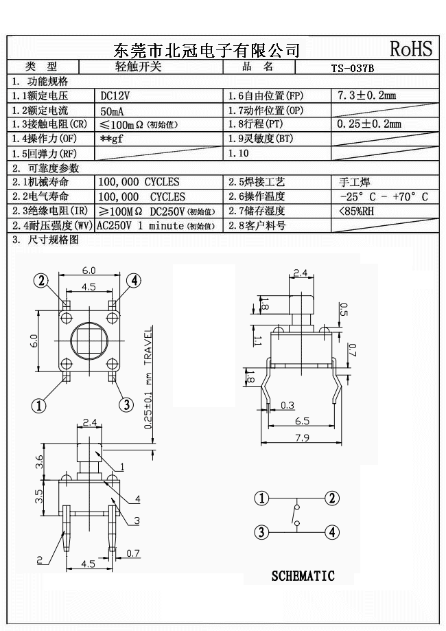 TS-037B是6*6*7.3輕觸開關(guān),高度是固定的,按鍵頭尺寸是2.4*2.4,輕觸開關(guān)按鍵力度有160g/250g四種。屬于環(huán)保輕觸開關(guān)